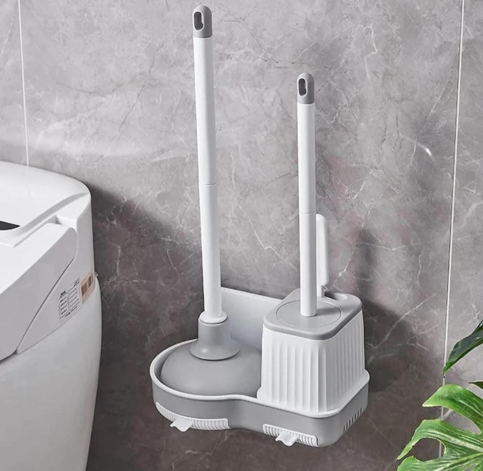 A practical 3-in-1 cleaning set featuring a toilet brush, plunger, and holder stand designed to keep your bathroom spotless and organized.