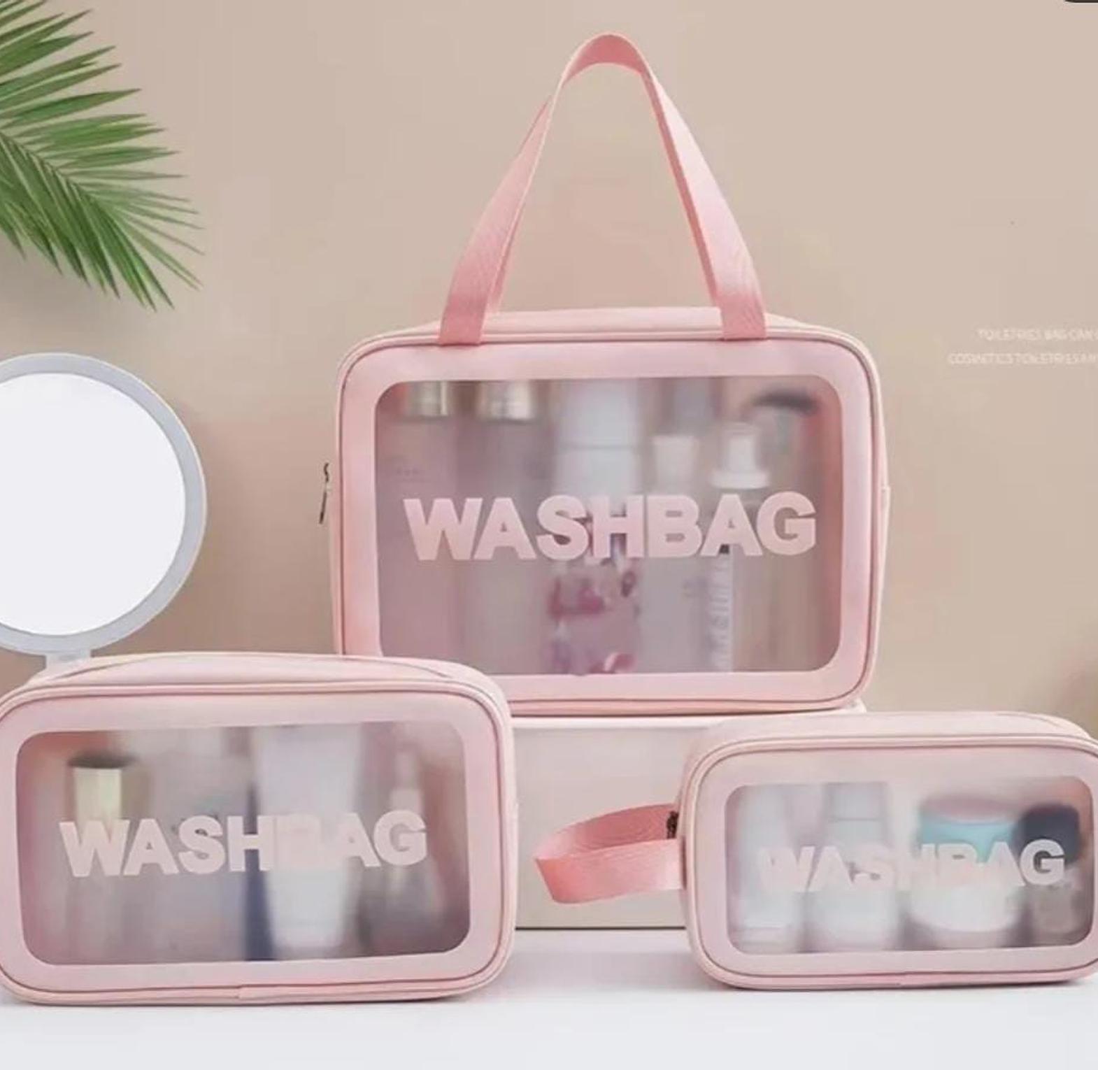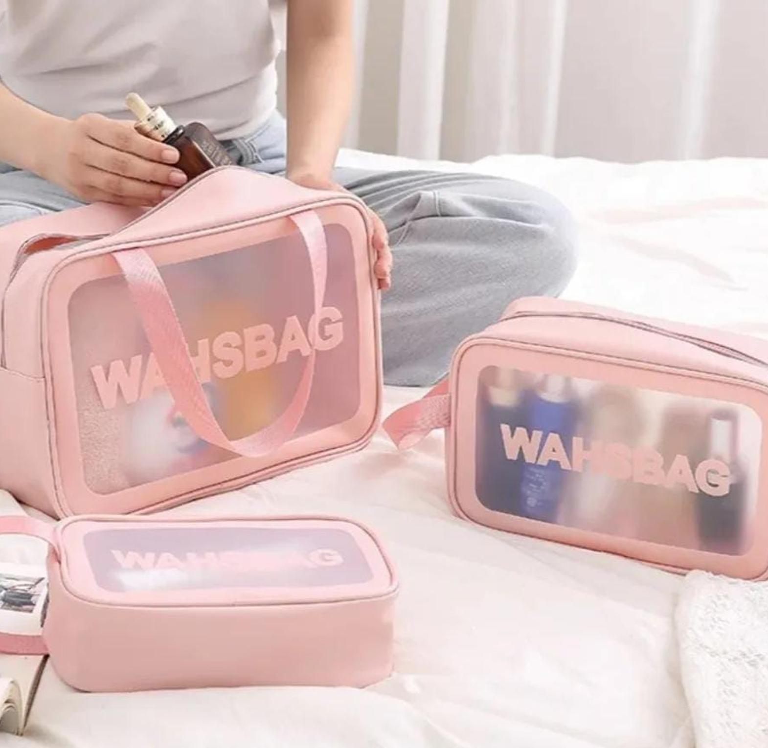 A versatile 3-piece waterproof bag set for storing makeup, toiletries, and travel essentials with ease.