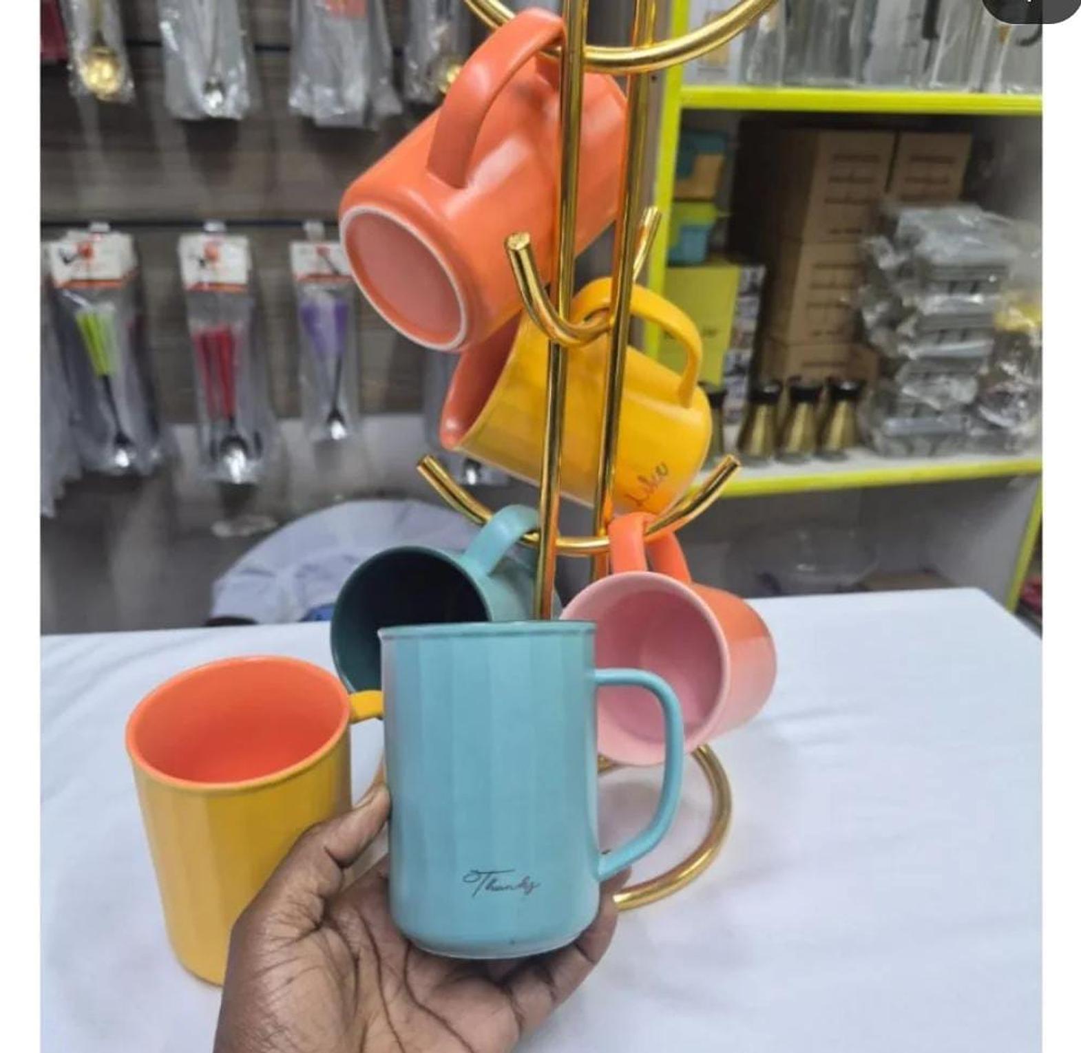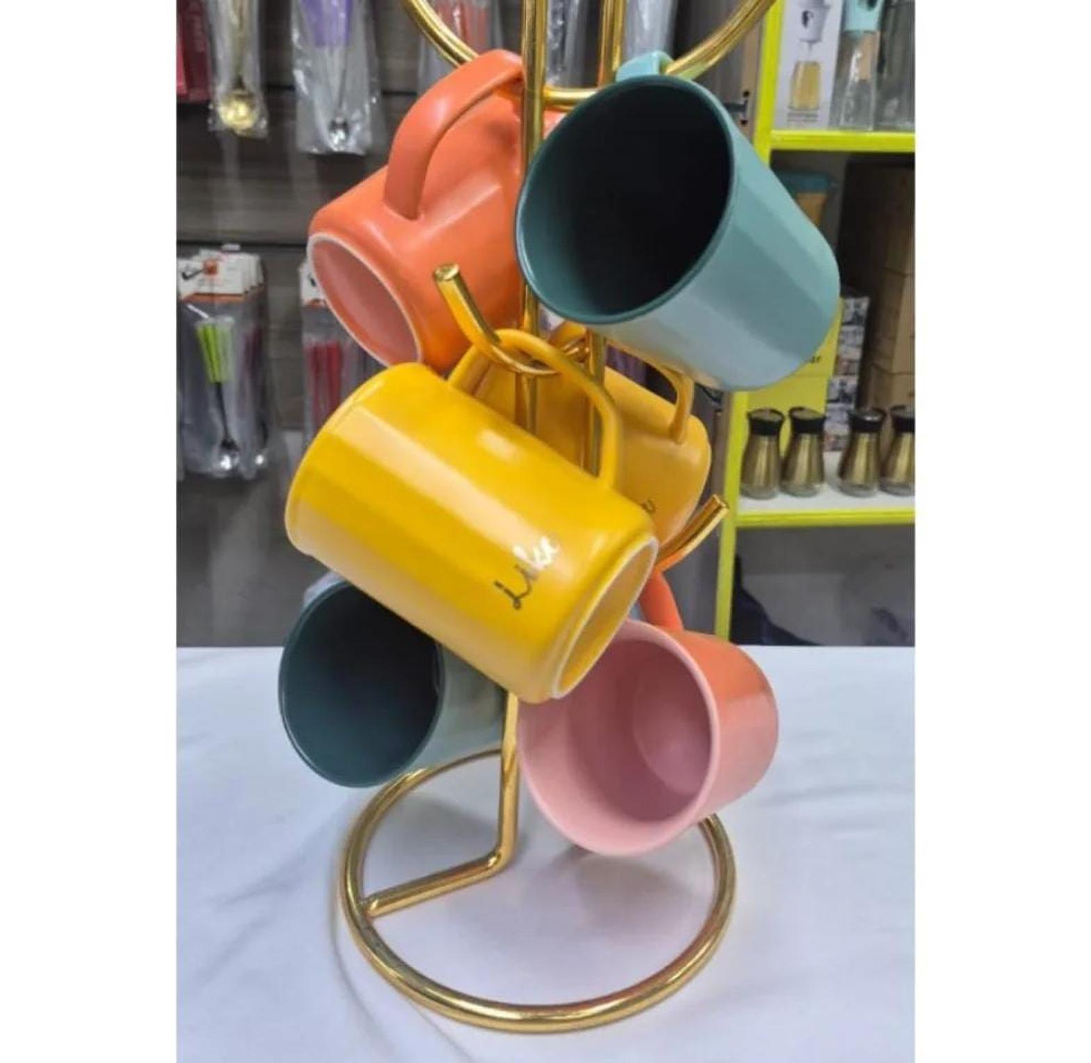 A lively set of six ceramic mugs in bold, eye-catching colors — perfect for adding personality to your daily coffee or tea moments.