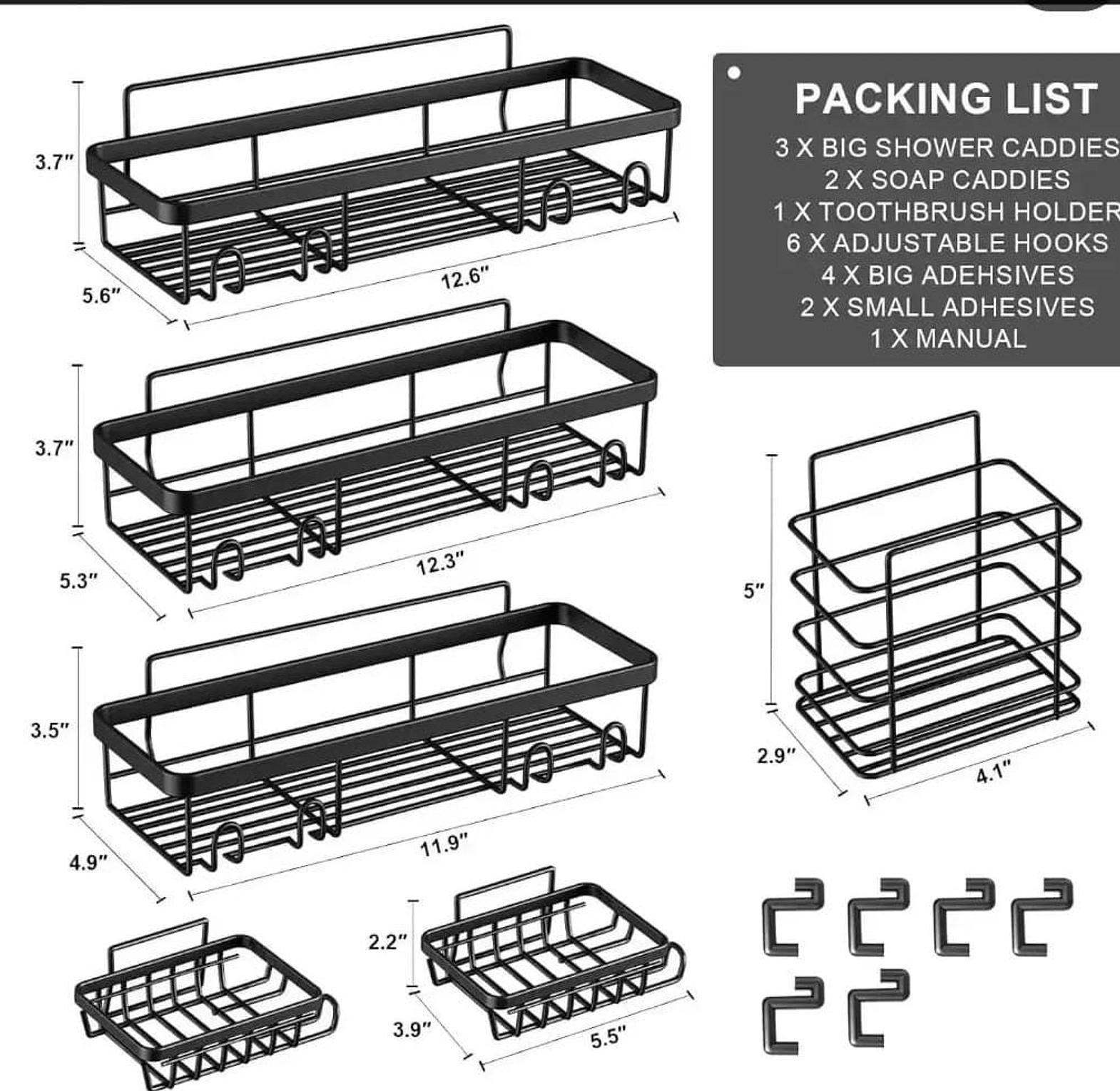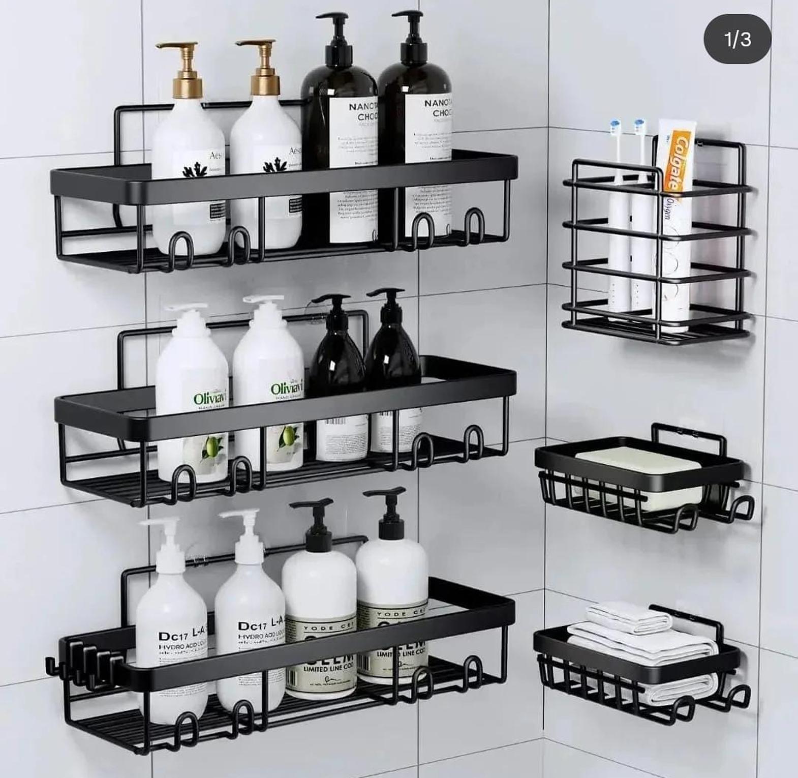 A 6-piece shower caddy set designed to neatly store toiletries, keep essentials within reach, and maximize bathroom space.