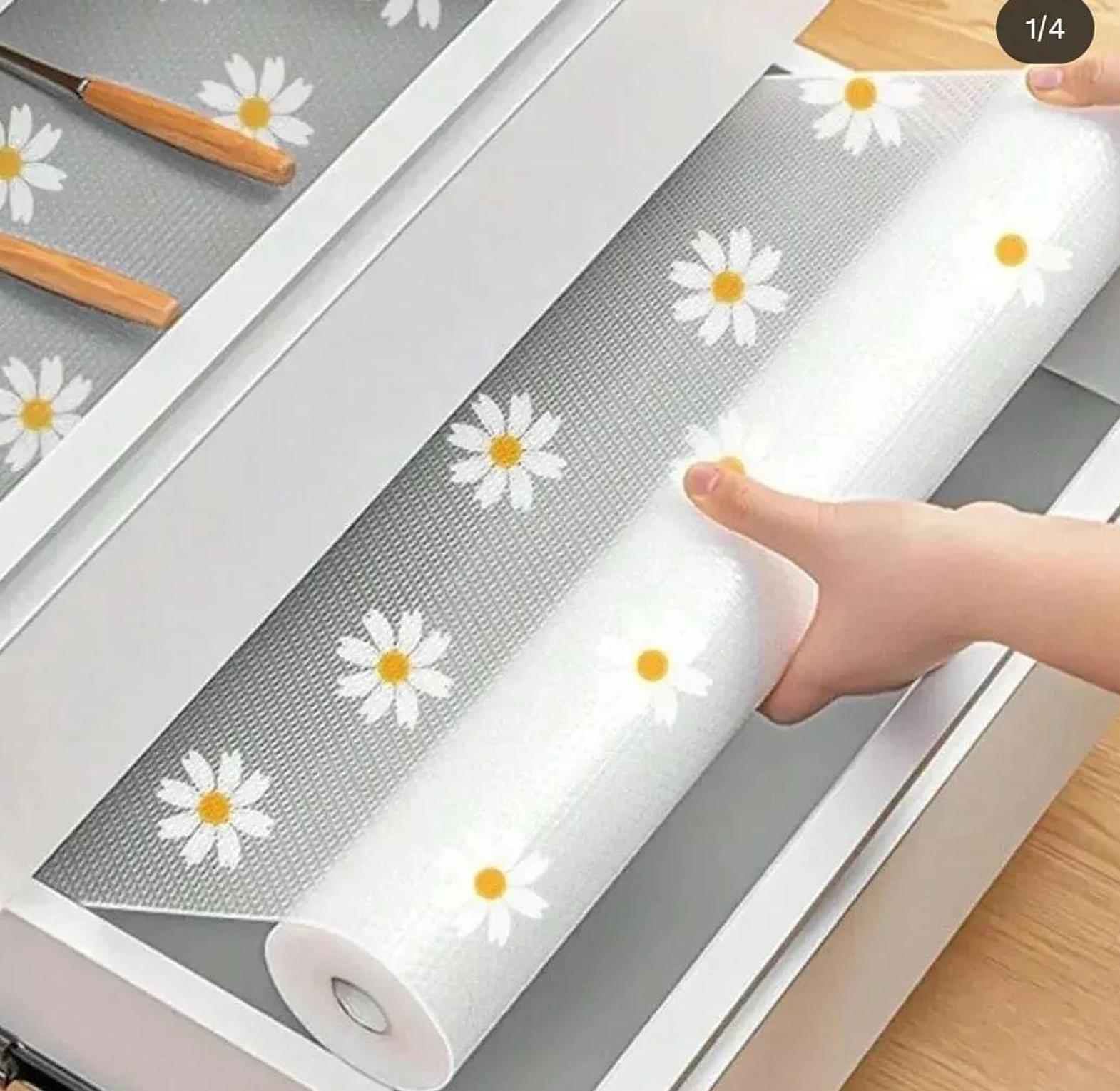 Colorful daisy-patterned liners designed to protect drawers and shelves while adding a cheerful touch to your kitchen.