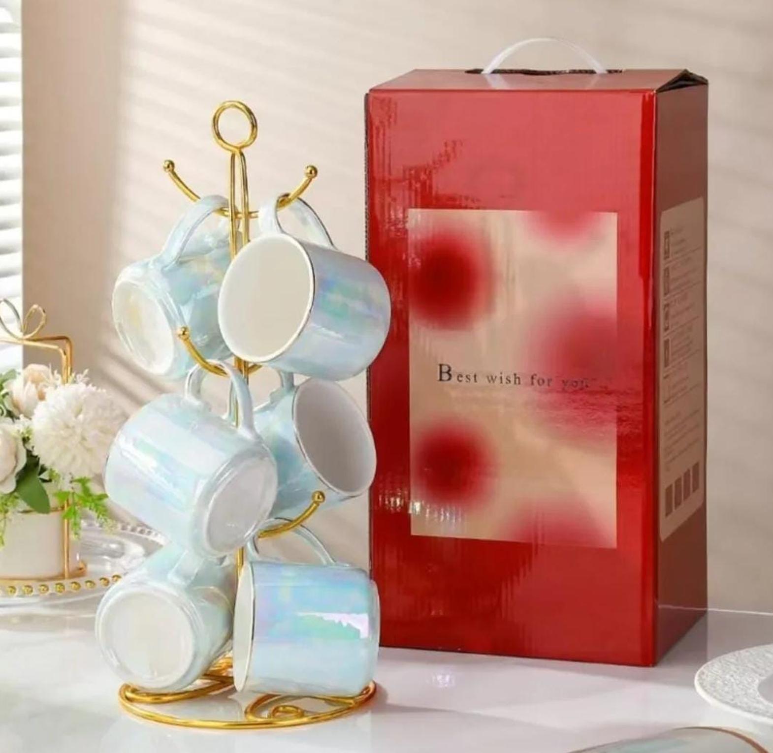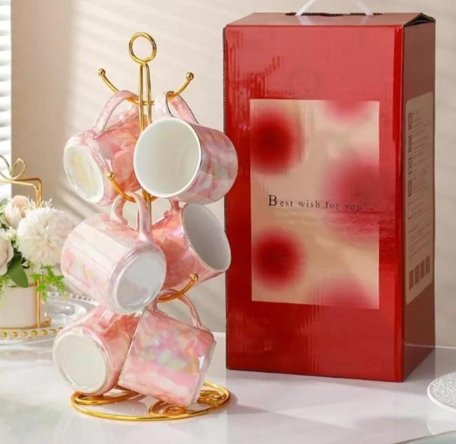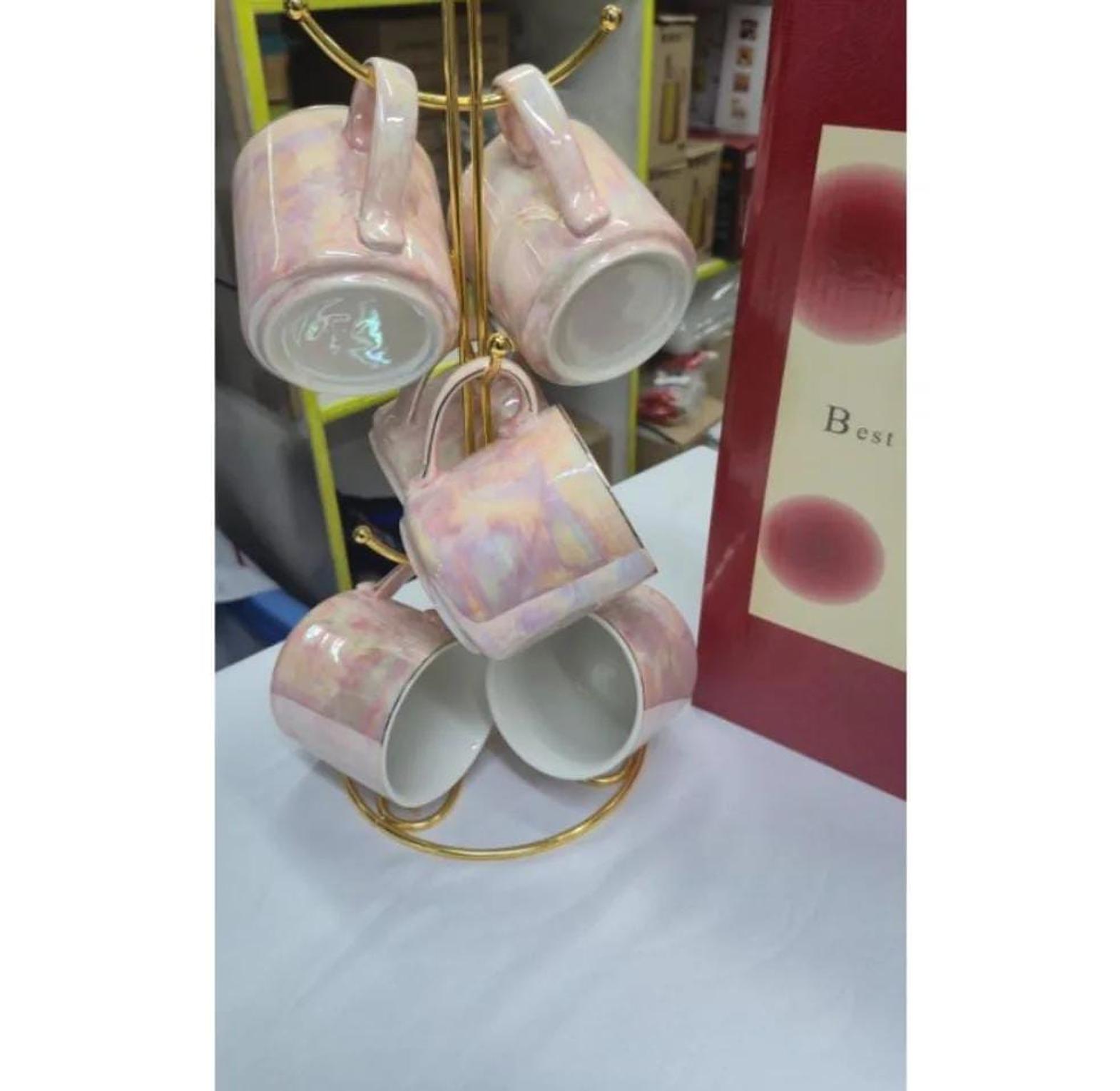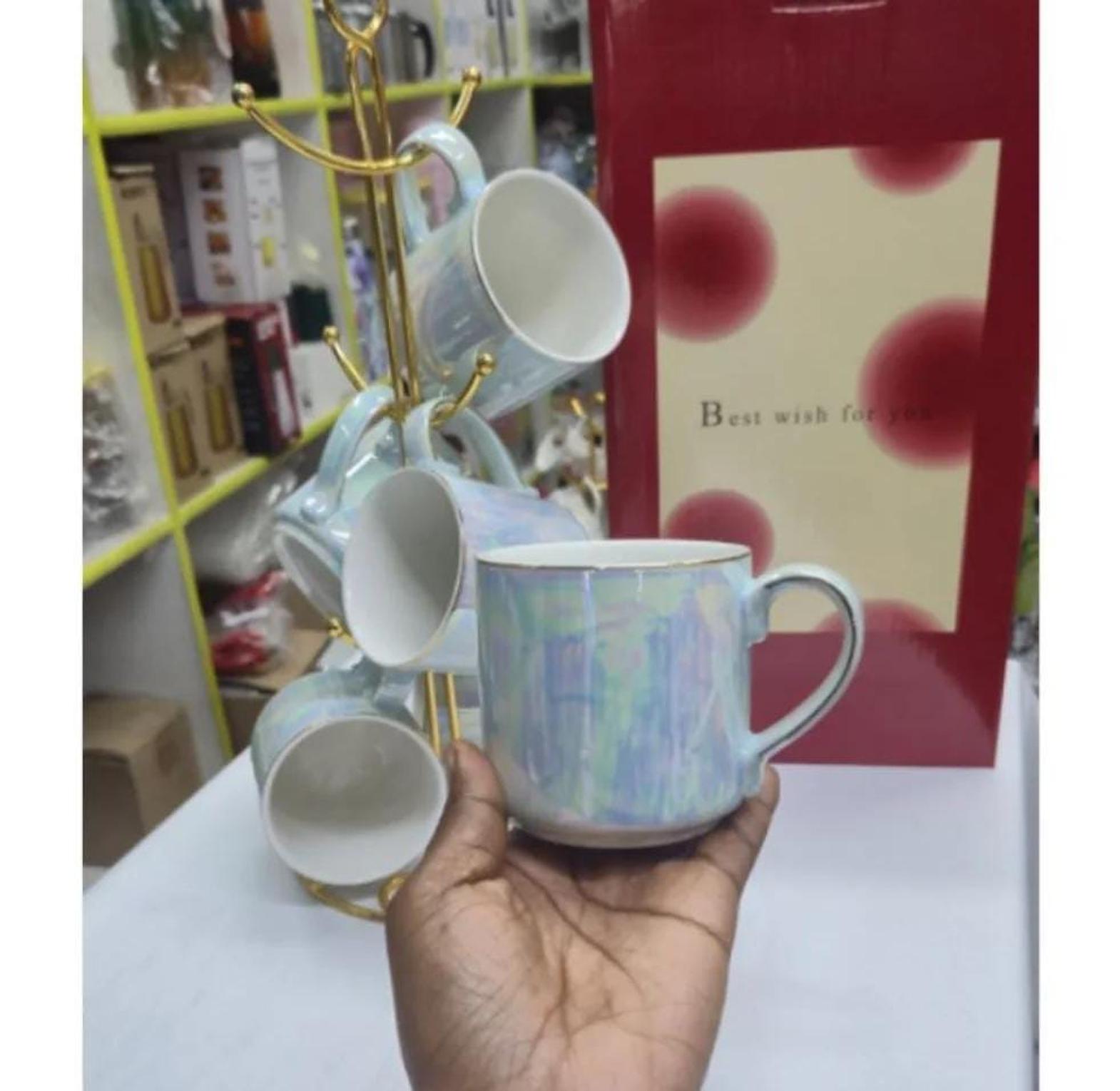 A luxurious 6-piece set of gold-rimmed ceramic mugs with an elegant gold stand — the perfect blend of function and sophistication.