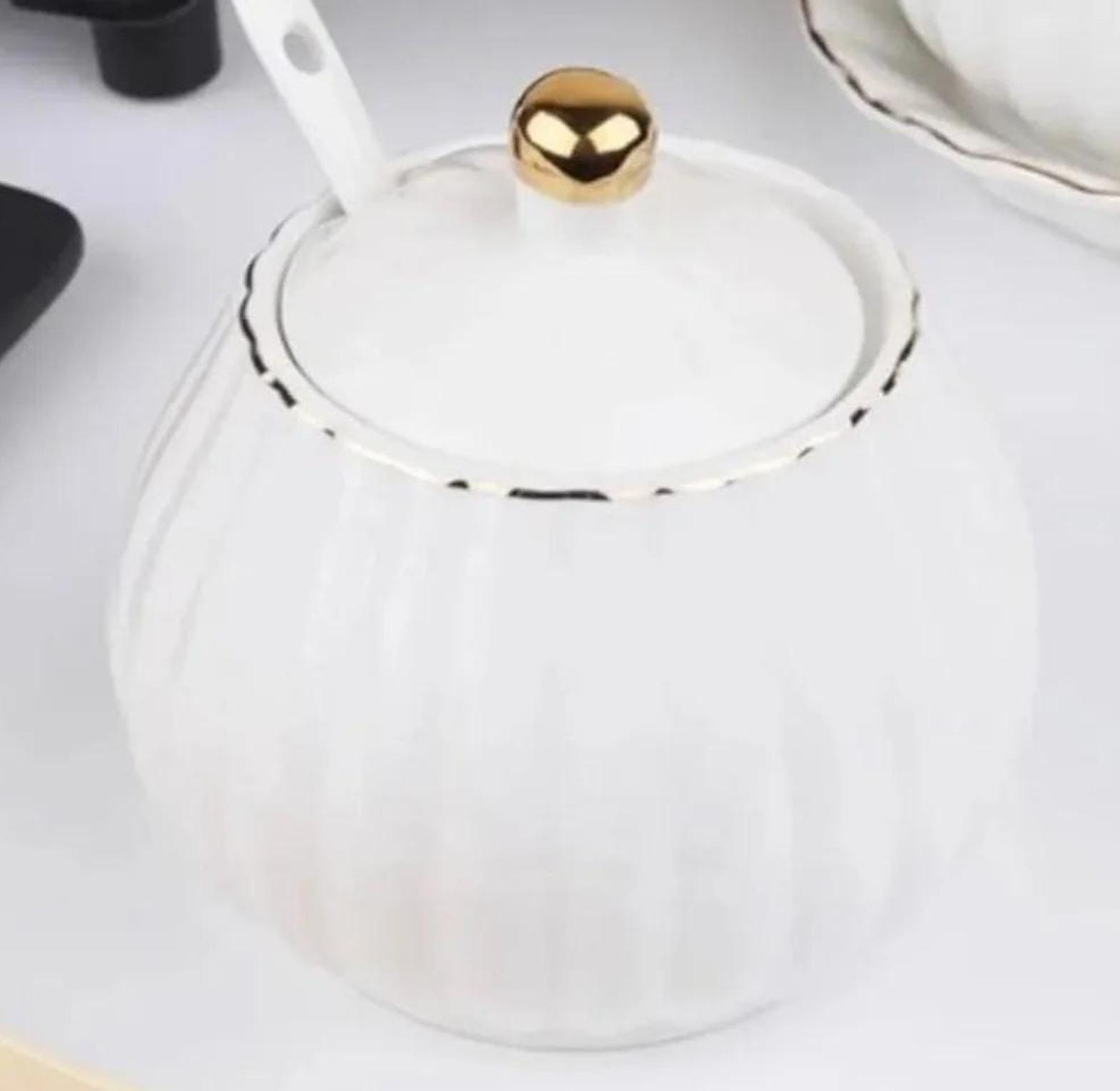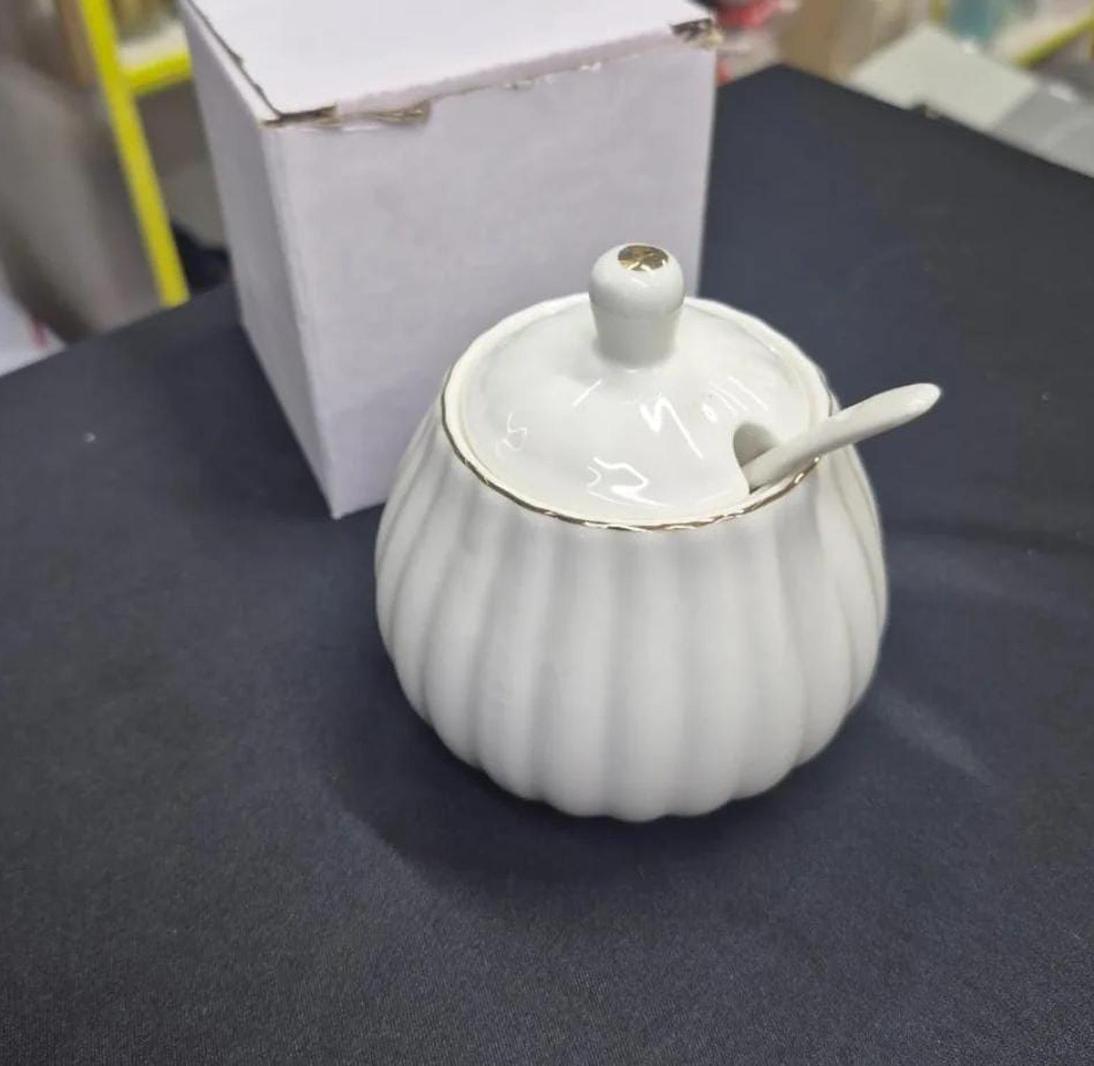 A beautifully crafted ceramic sugar dish with a gold rim and matching spoon, designed to add a touch of luxury to your coffee or tea setup.