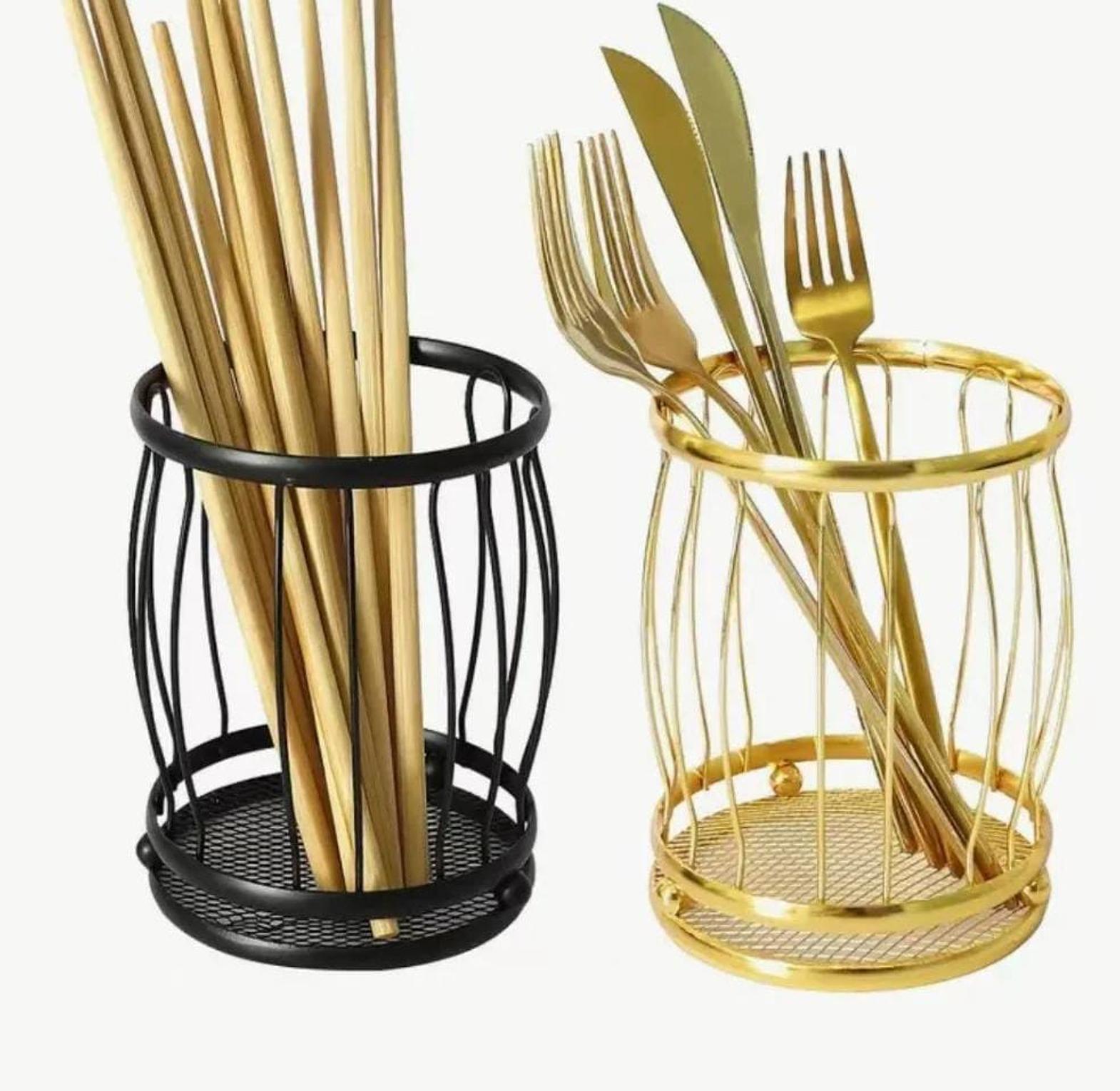 A strong and elegant metal cutlery holder designed to neatly store and dry your kitchen utensils while keeping your countertop organized.