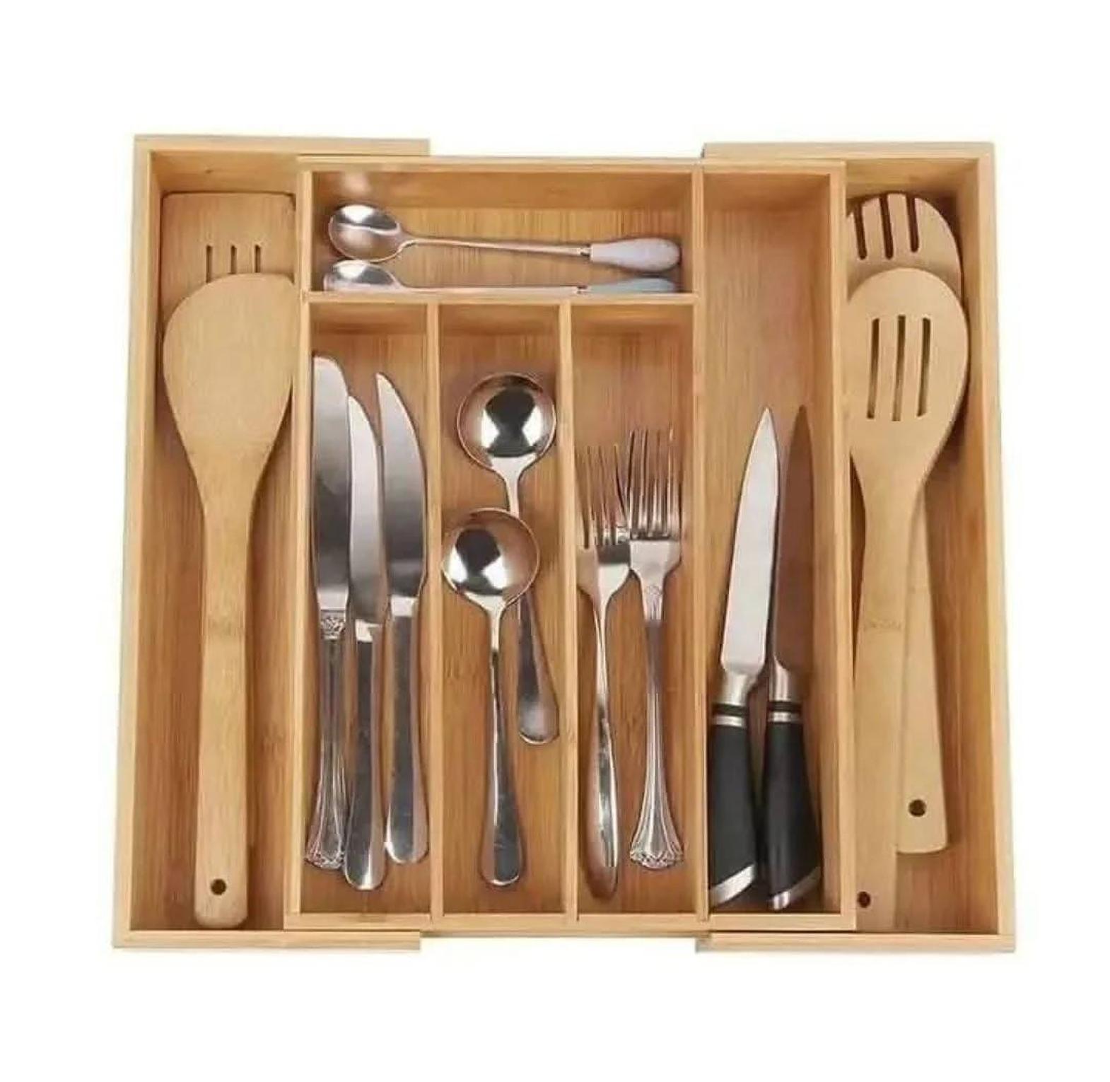Organize your drawers with style and sustainability using this versatile bamboo organizer.