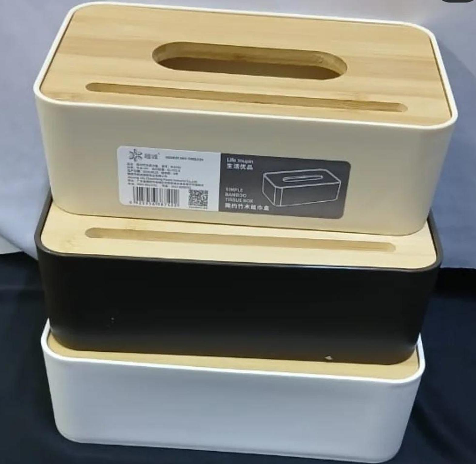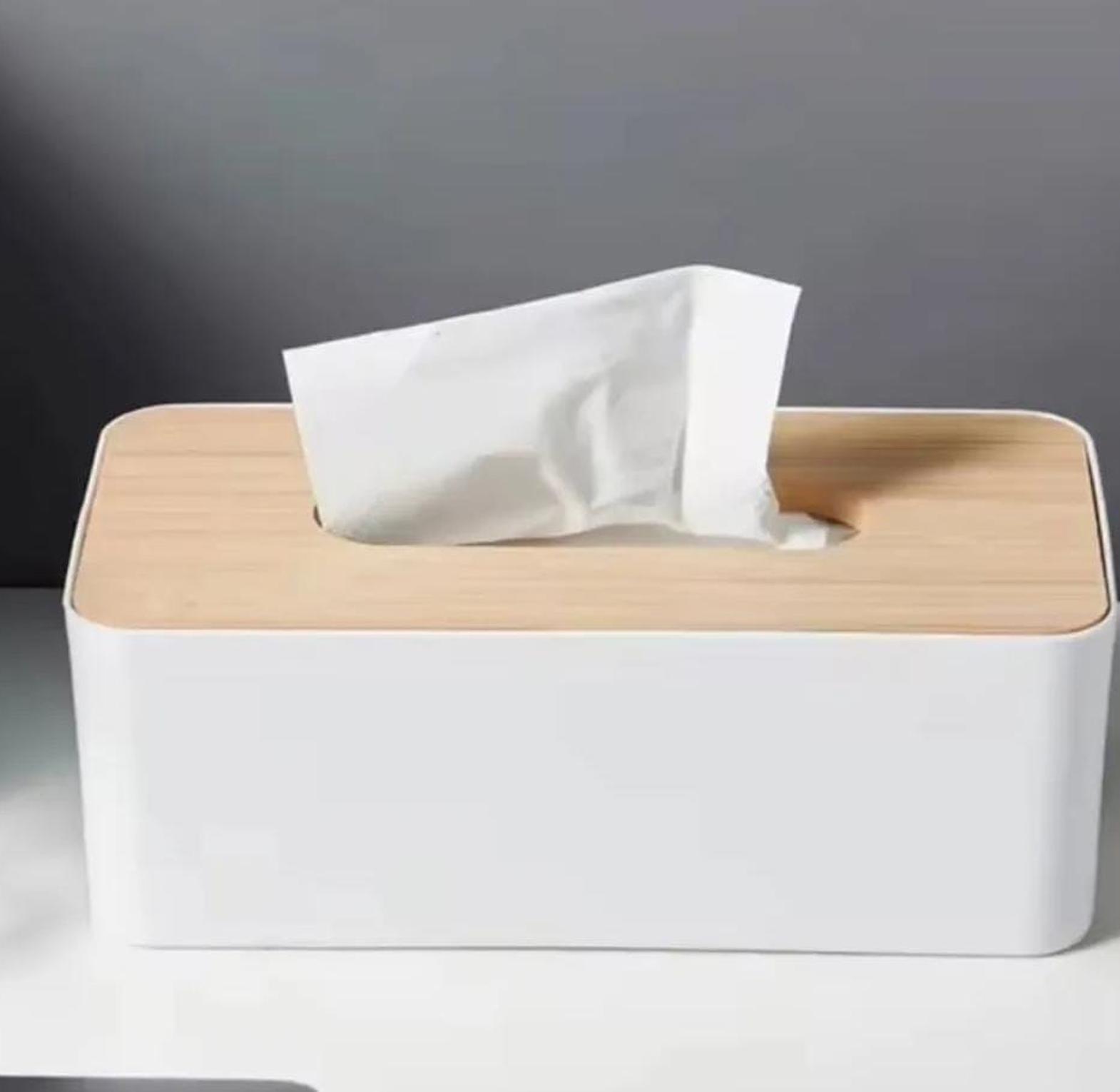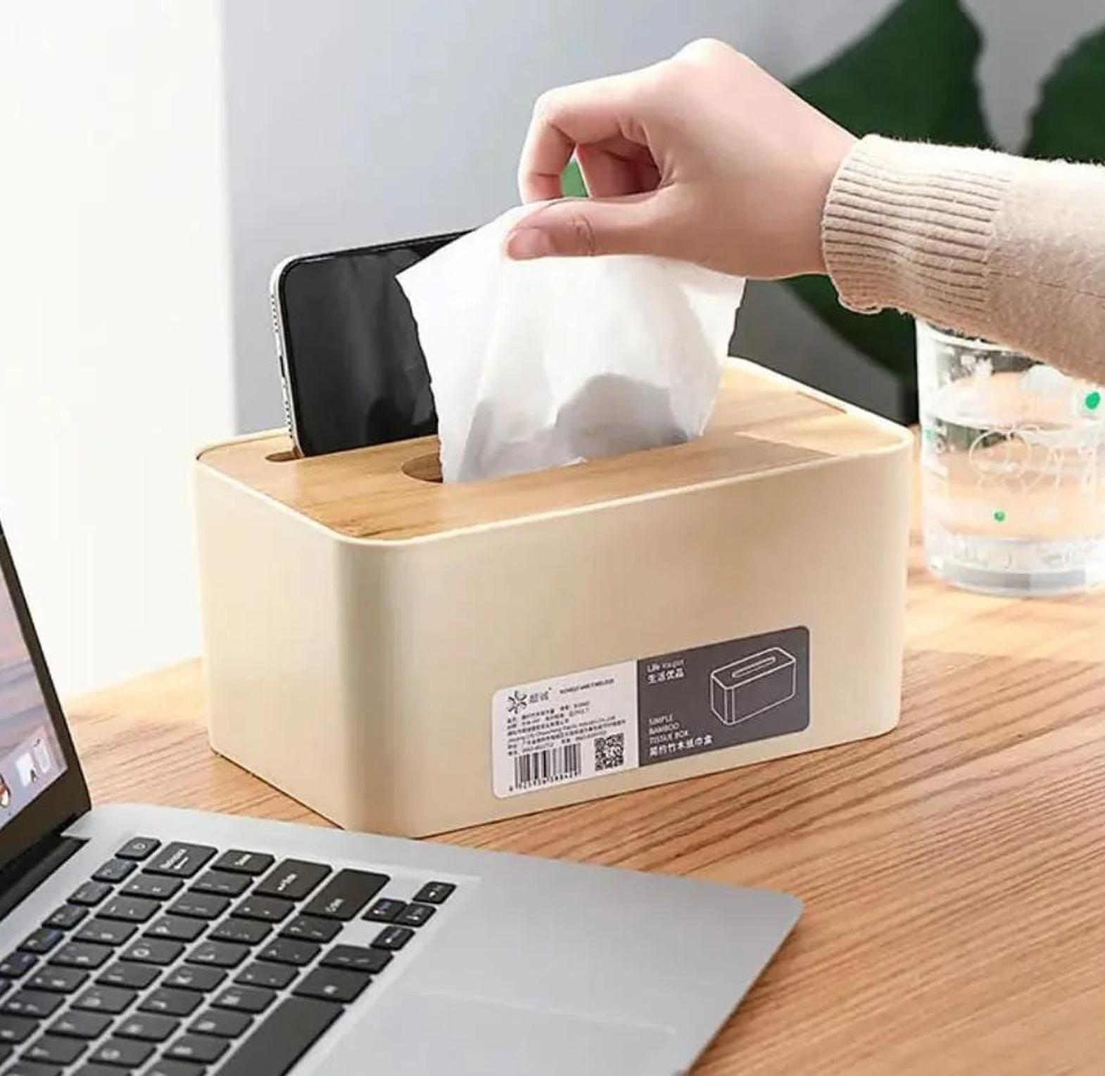 A sleek napkin holder with a bamboo wood cover, blending modern design with natural warmth for stylish table organization.