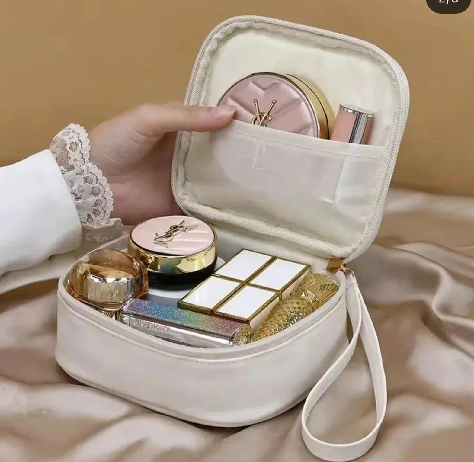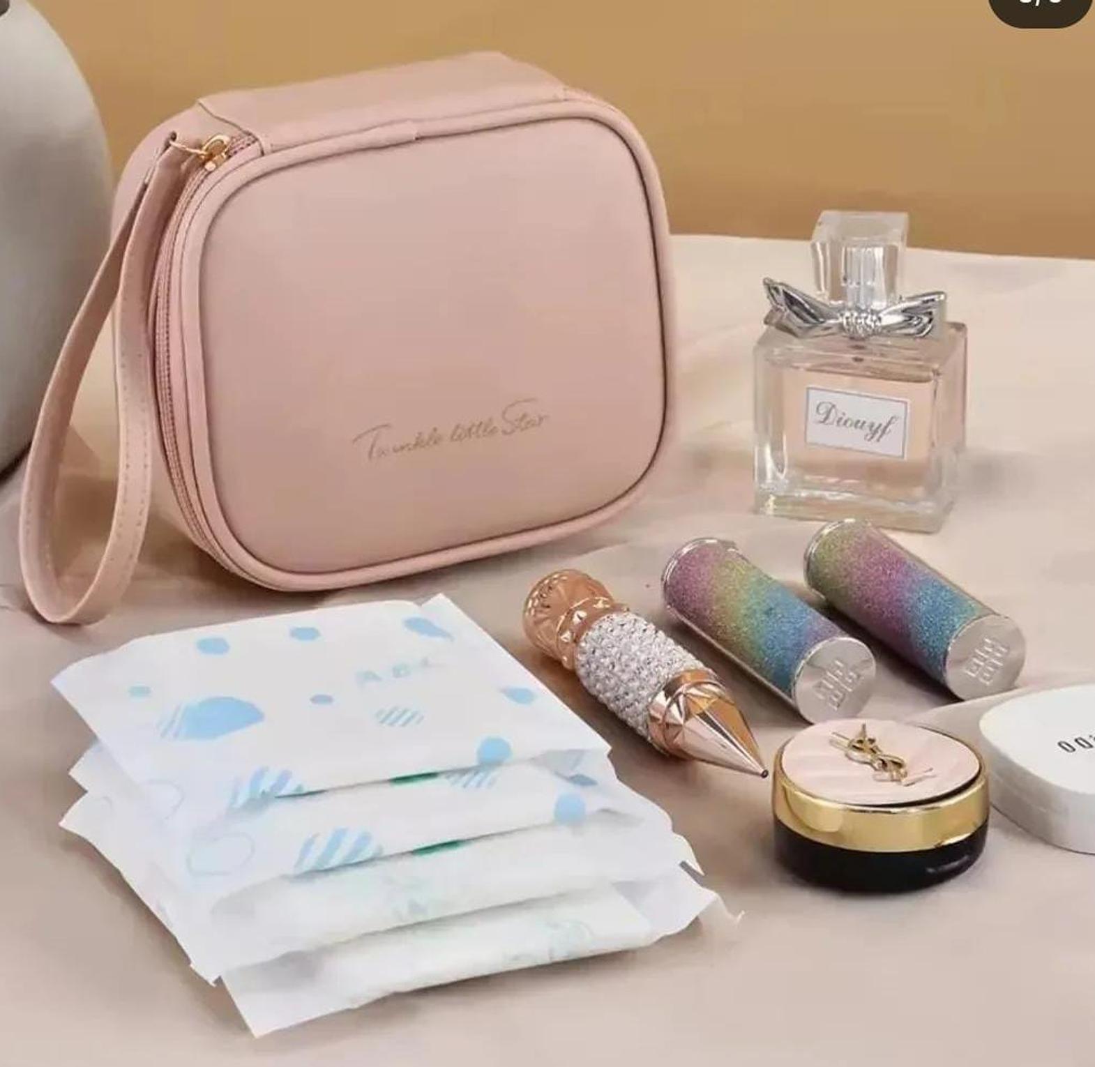 A stylish, slim zipper pouch designed to discreetly carry pads, tampons, lotion, and other small essentials.