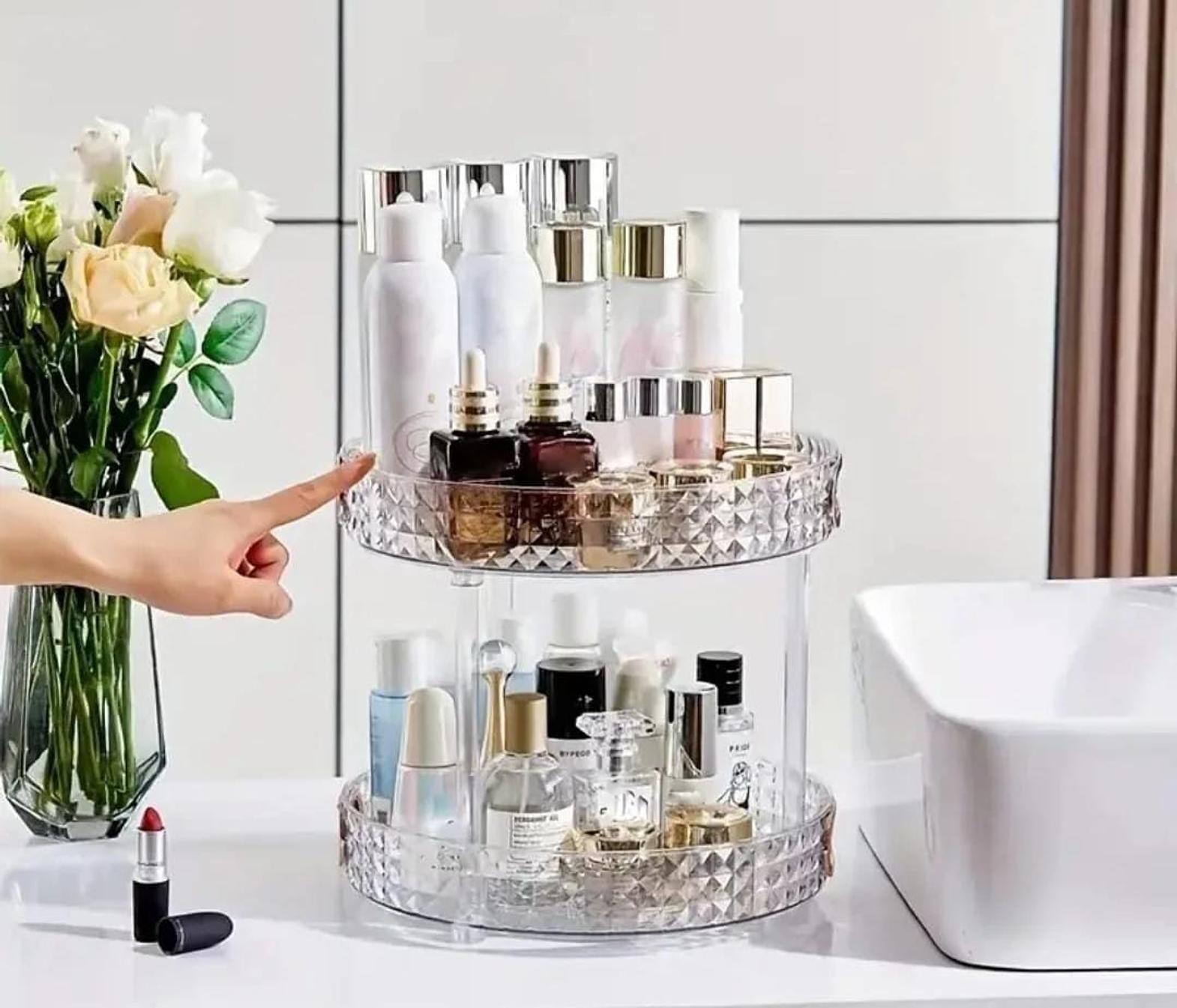 A chic two-tier rotating organizer in clear acrylic with gold handles, perfect for cosmetics, perfumes, and accessories