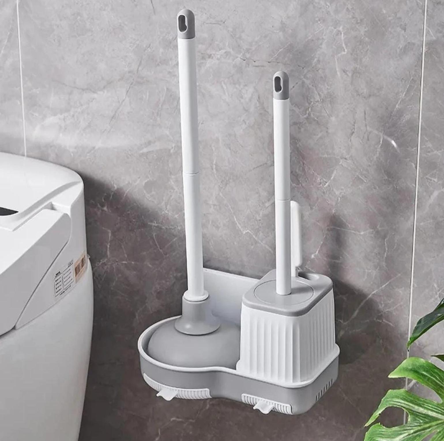 A practical 3-in-1 cleaning set featuring a toilet brush, plunger, and holder stand designed to keep your bathroom spotless and organized.