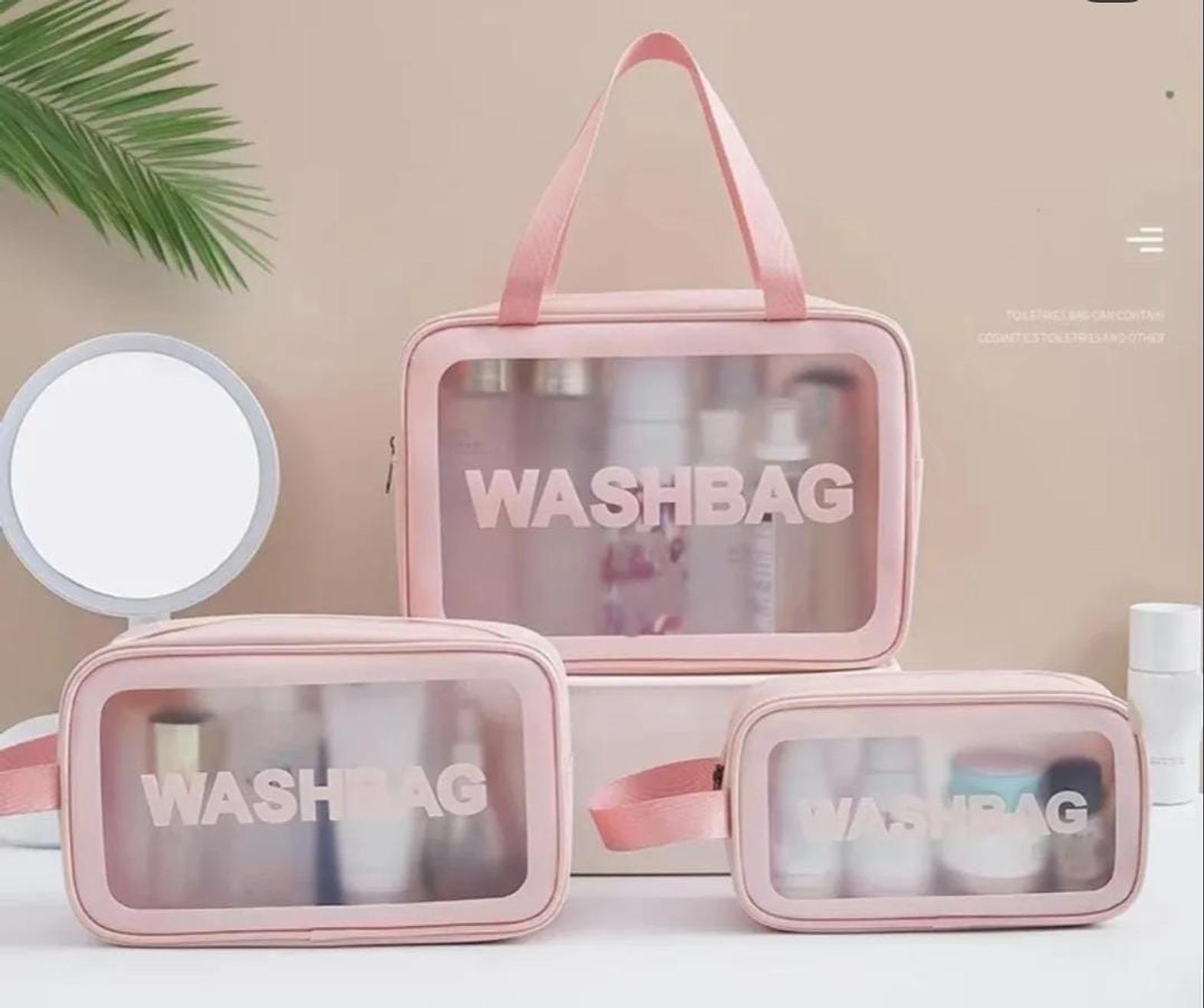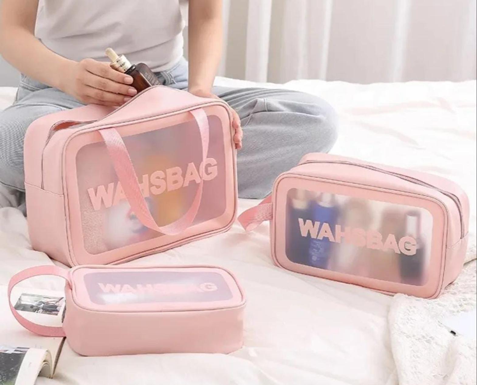 A versatile 3-piece waterproof bag set for storing makeup, toiletries, and travel essentials with ease.