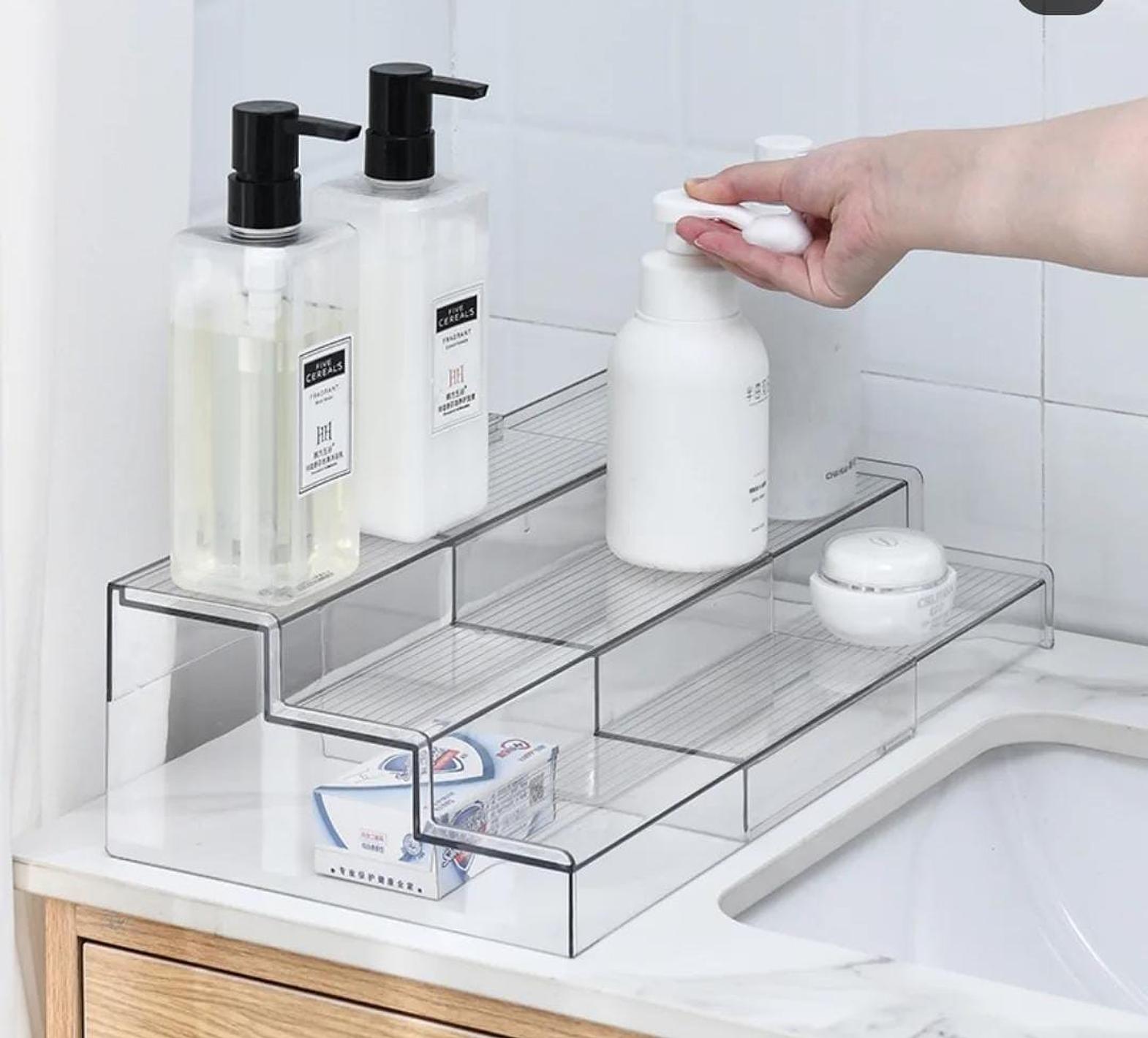 A sleek and sturdy 3-tier acrylic rack designed to expand and organize your spices, cosmetics, or essentials with elegance and ease.