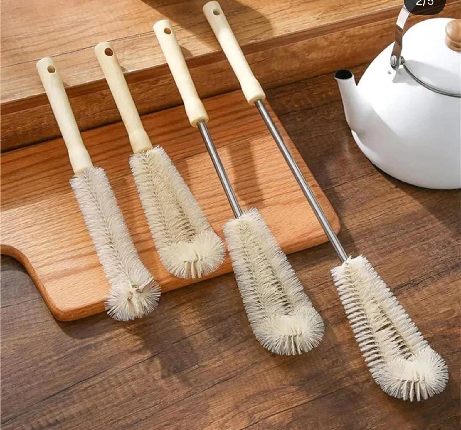 A set of 4 long-handled brushes designed to clean bottles, jars, flasks, and narrow containers effectively.