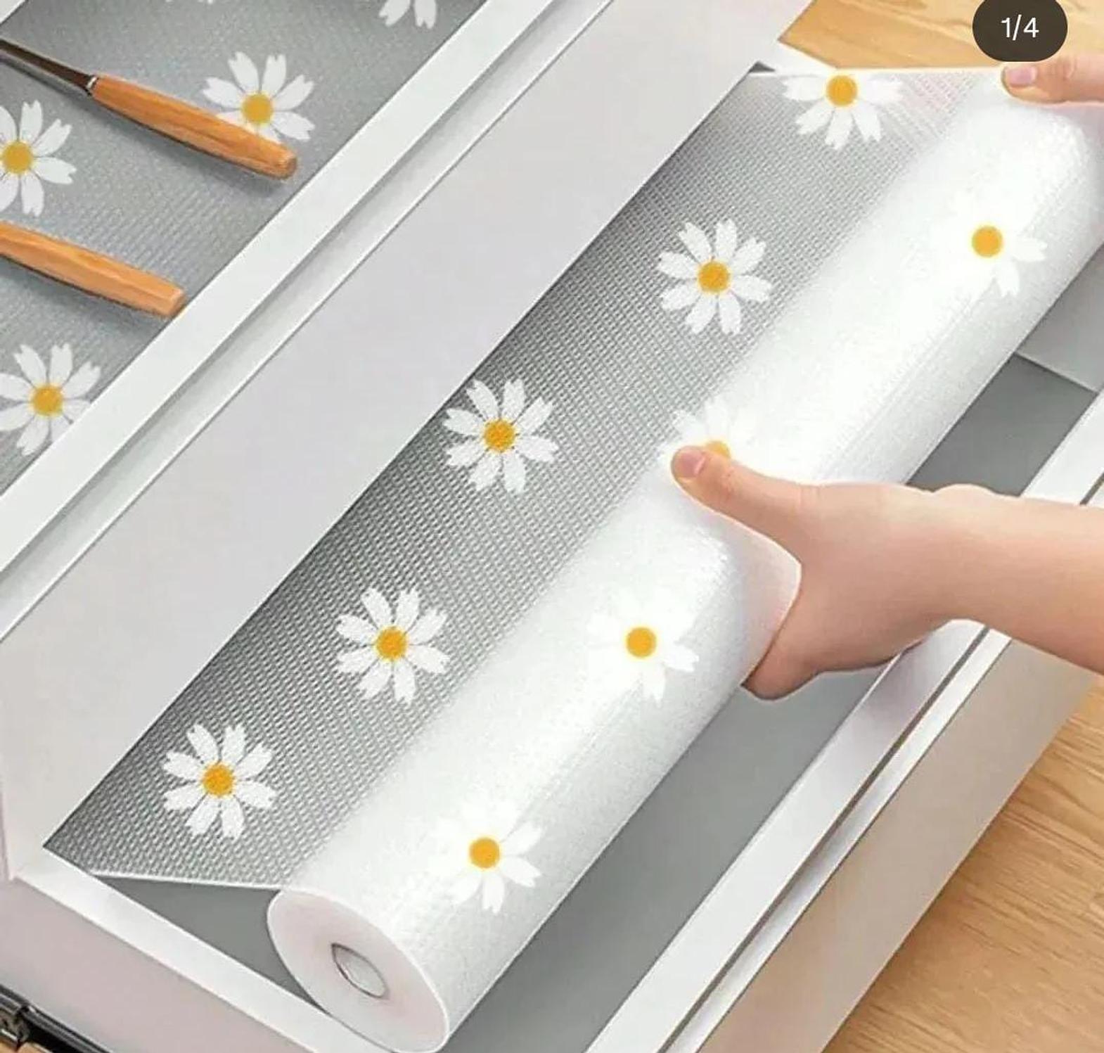 Colorful daisy-patterned liners designed to protect drawers and shelves while adding a cheerful touch to your kitchen.