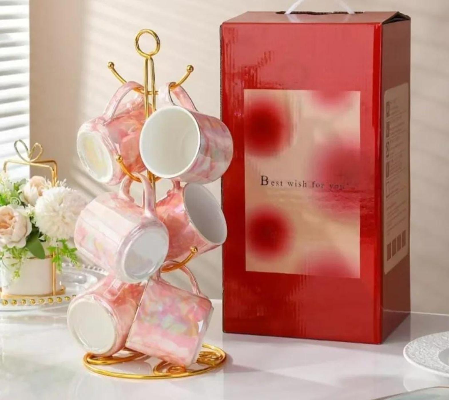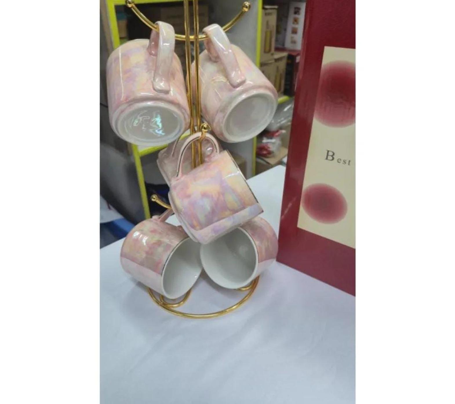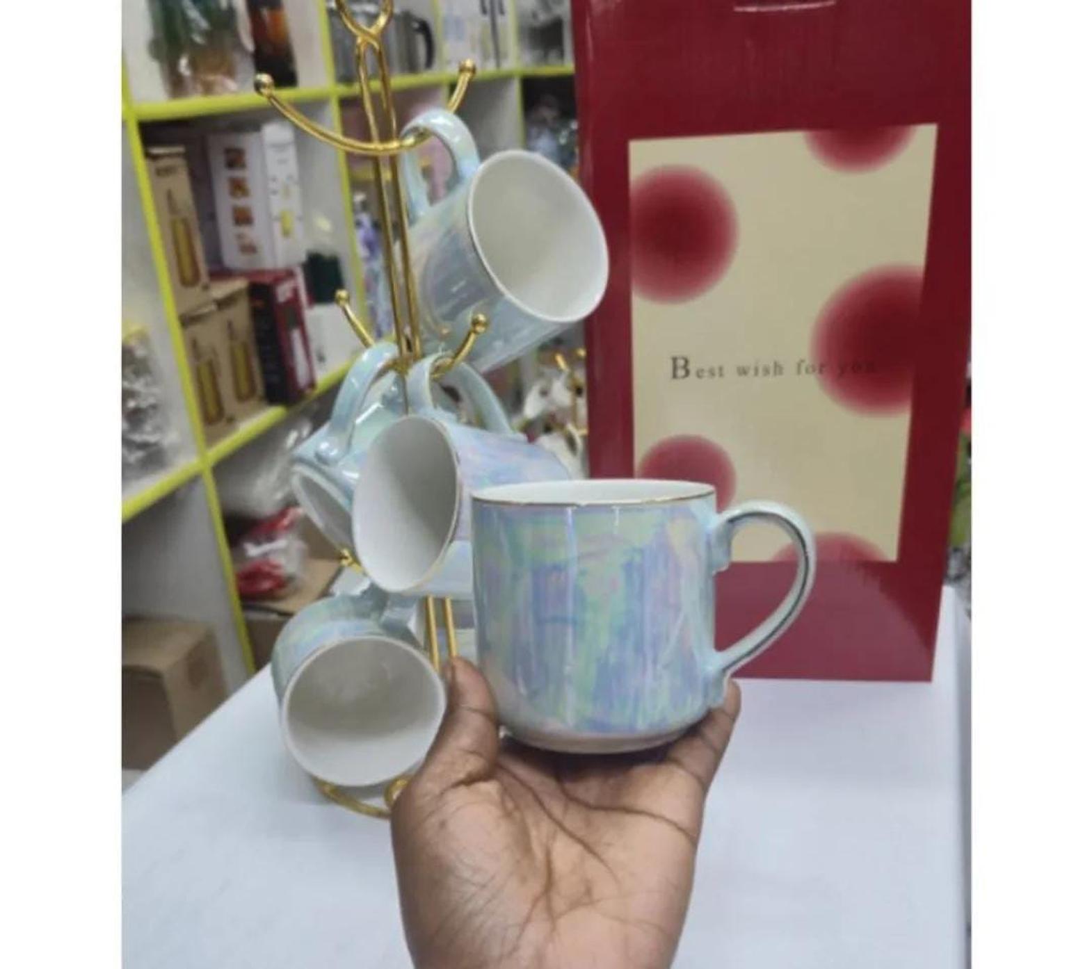 A luxurious 6-piece set of gold-rimmed ceramic mugs with an elegant gold stand — the perfect blend of function and sophistication.