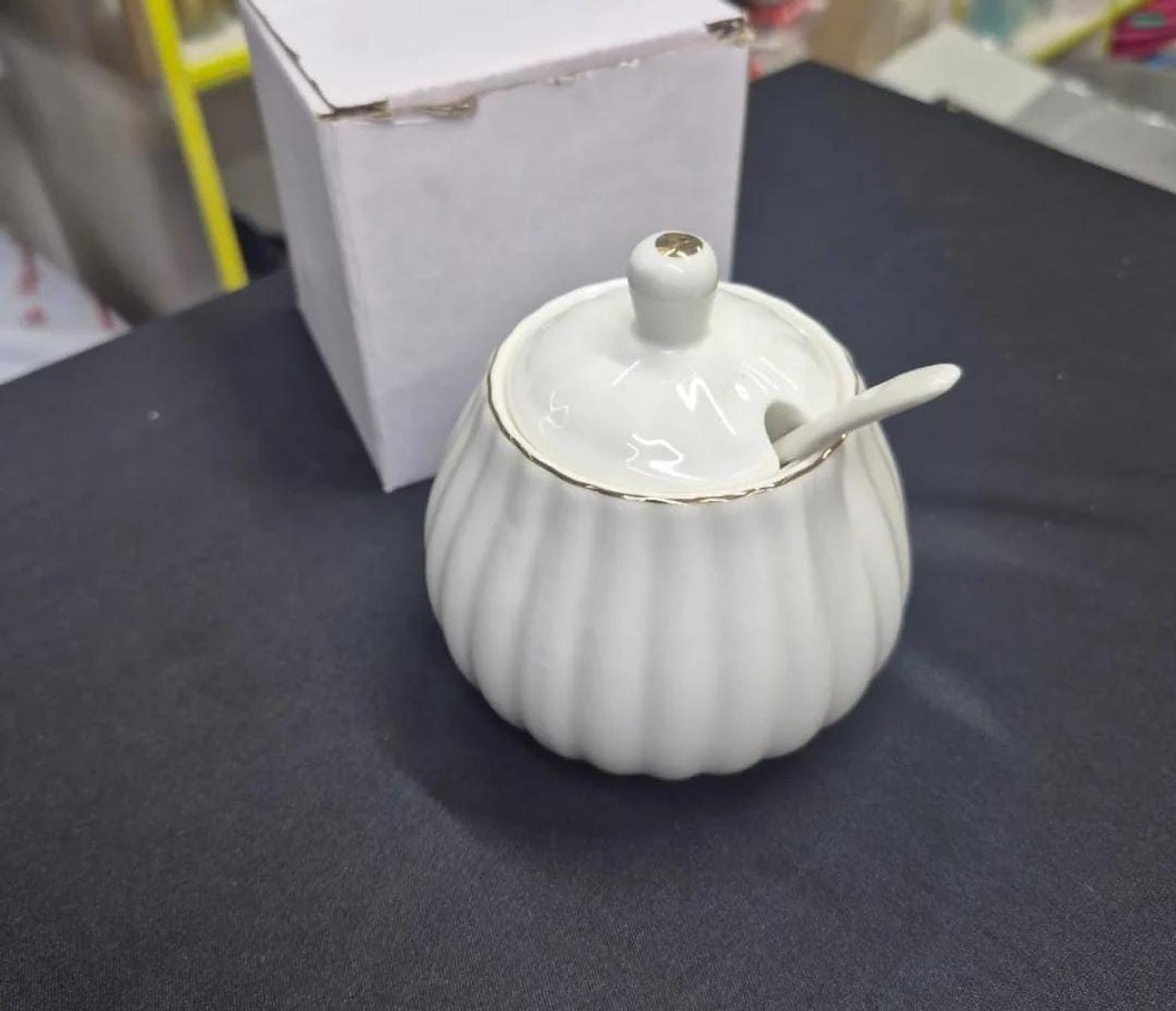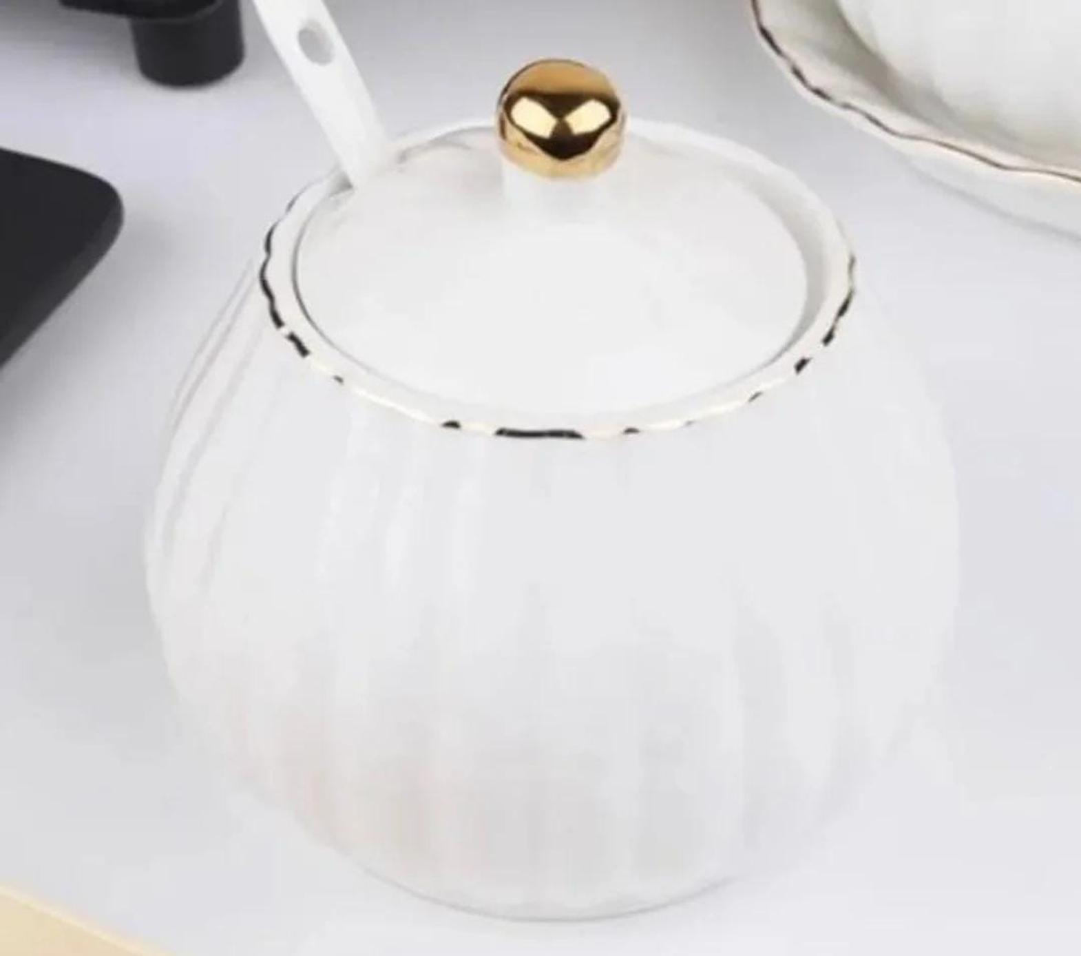 A beautifully crafted ceramic sugar dish with a gold rim and matching spoon, designed to add a touch of luxury to your coffee or tea setup.