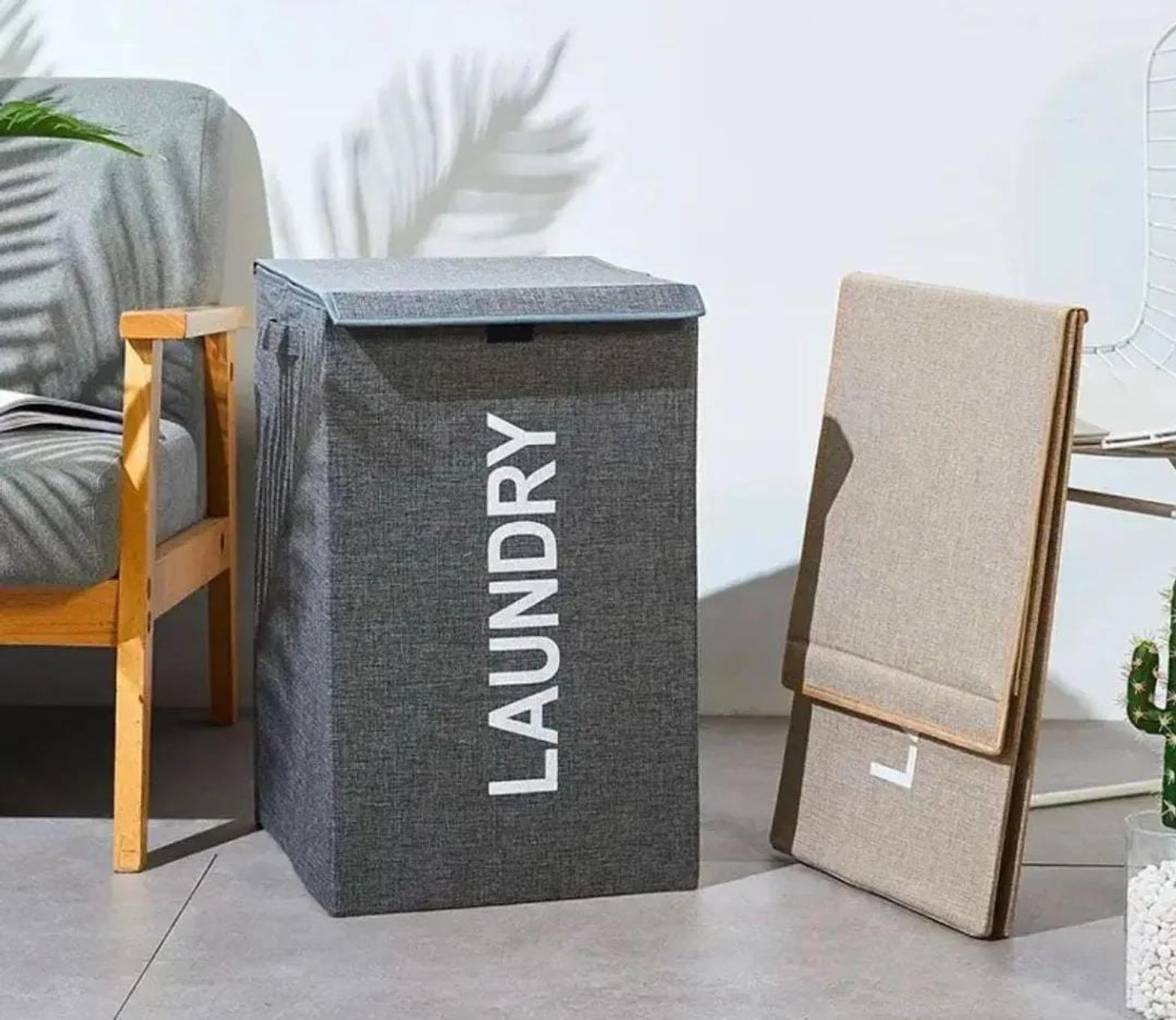 A spacious, foldable laundry basket designed with a secure lid and strong handles for convenient, tidy, and effortless laundry organization.