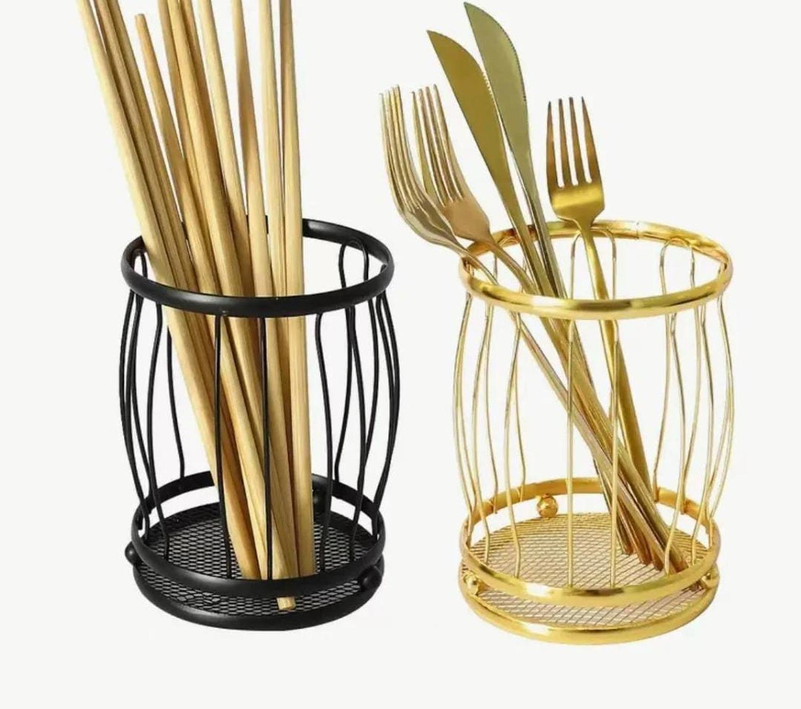 A strong and elegant metal cutlery holder designed to neatly store and dry your kitchen utensils while keeping your countertop organized.