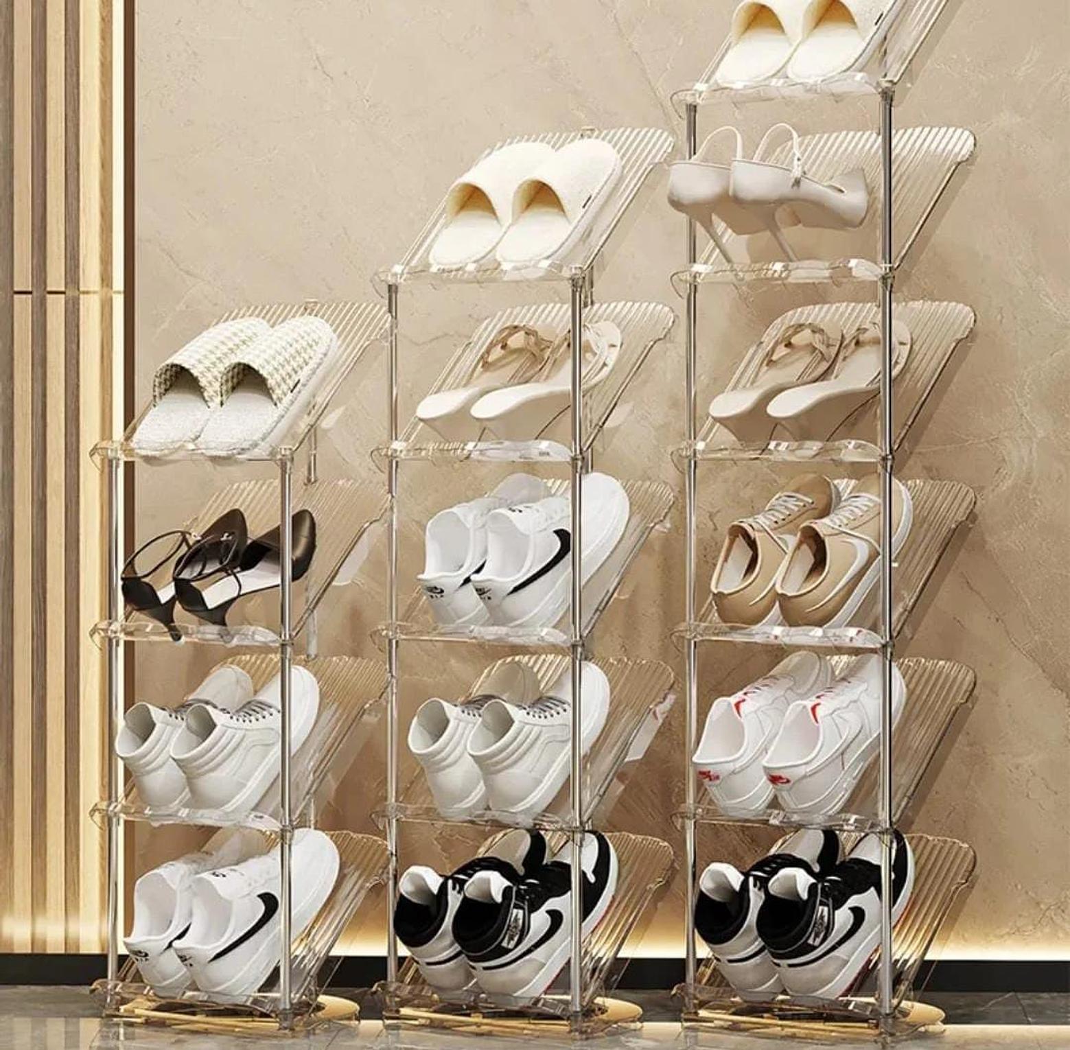 A stylish, transparent, and stackable shoe rack designed to neatly organize and display your footwear while saving space in your entryway or closet.
