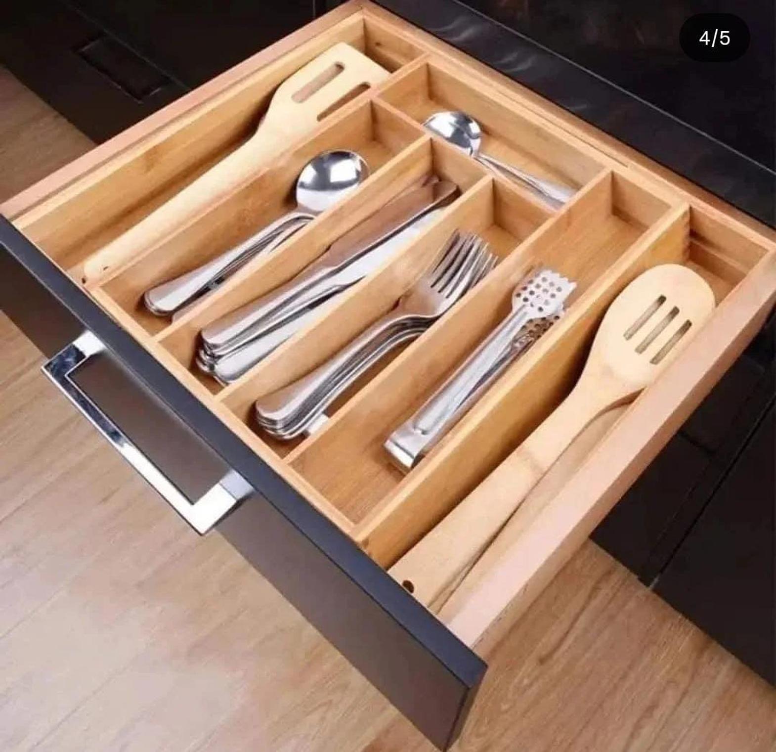 Organize your drawers with style and sustainability using this versatile bamboo organizer.