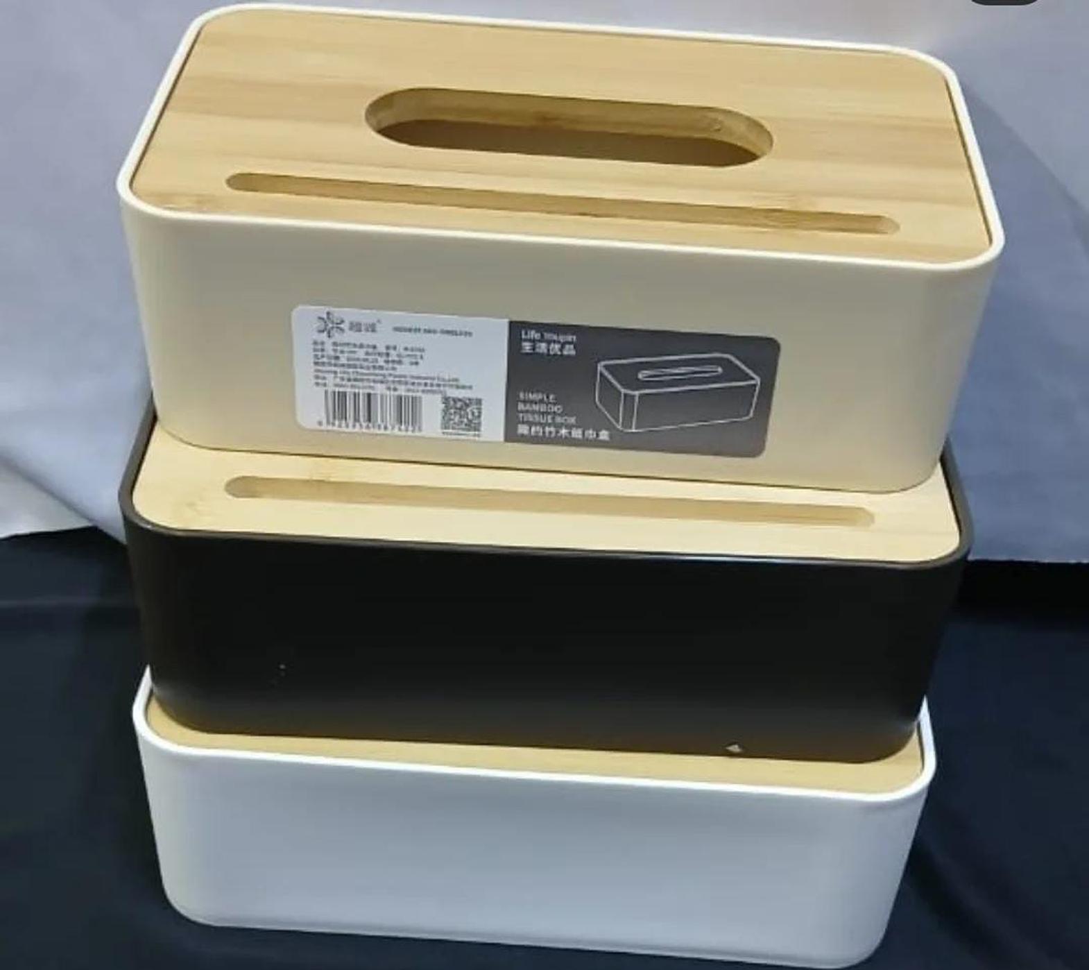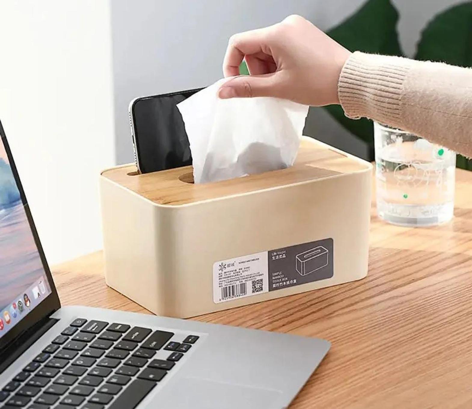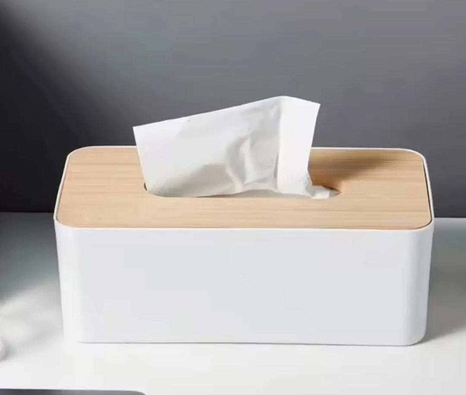 A sleek napkin holder with a bamboo wood cover, blending modern design with natural warmth for stylish table organization.